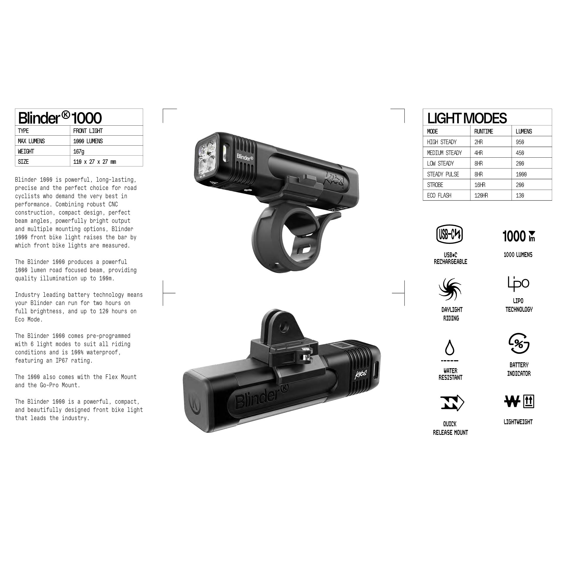 Le KNOG BLINDER PRO 1000 est également équipé de montages polyvalents pour cintres de 22 à 35 mm et offre une visibilité latérale optimale. Avec une autonomie de 2 heures en pleine puissance, il combine sécurité, performance et praticité pour toutes vos sorties.