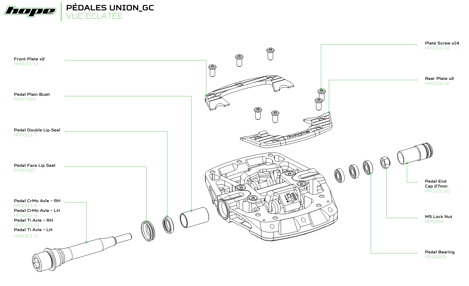 La construction de la pédale Hope Union Gravity GC est ultra-robuste, la forme est étudiée pour un maximum de résistance et d'adhérence. Les 7 picots remplaçables et ajustables par face sont résistants et facilement interchangeables même en étant endommagés.