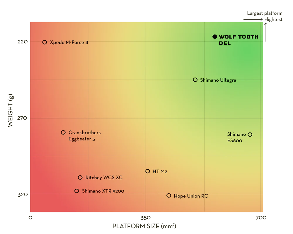 Une surface de plateforme plus grande pour le transfert de puissance que la concurrence avec 559 mm² (comparé au Xpedo MF8 à 46 mm², au Shimano XTR 9200 à 144 mm² et à l’Eggbeater 3 à 102 mm²)