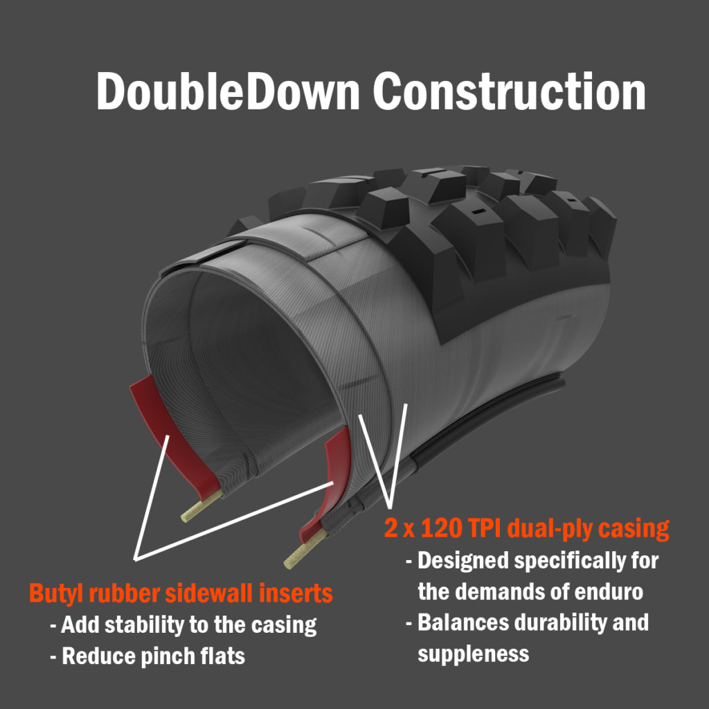 DoubleDown (DD) est une carcasse conçue pour l'enduro et les VTT électriques. Elle combine deux couches de matériau léger 120 TPI avec un insert en butyle sur les flancs, offrant une excellente durabilité et un meilleur ressenti du terrain qu'une carcasse Downhill. Légèrement plus léger qu'un pneu DH, le DoubleDown se distingue surtout par son toucher plus vif, bien que certains pilotes préfèrent l’amorti supérieur d’une carcasse DH.